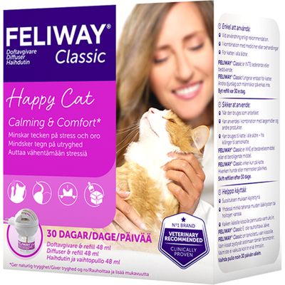 Denne Feliway Classic Diffusor & refill hjælper med at skabe en øget tryghed i hjemmet for katte, så de nemmere kan finde ro og slappe af. Når katten føler sig tryg i sine vante omgivelser, viser den det ved at gnide sig imod forskellige ting for at afsætte duftsignaler. Katten afsætter et feromon, som overføres og er med til at signalere det er et trygt sted at være. Når der sker forandringer i kattens omgivelser, kan katten blive stresset og urolig og i sådanne situationer kan man med fordel anvende Feliway Classic Diffusor + refill for at skabe en øget tryghed.