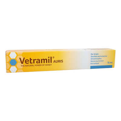 Indholdet er det samme som i Vetramil Auris Øredråber 50 ml i flaske. Her får du blot 15 ml i sprøjte, hvis det foretrækkes til behandlingen.