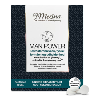 Det er dermed forståeligt, at mange mænd ønsker at bevare et optimalt testosteronniveau. Man Power fra Mezina er et kosttilskud for manden, der ønsker et normalt testosteronniveau samt at forbedre sin udholdenhed og fysiske formåen - især på det seksuelle område! Tabletterne er nøje sammensat af udvalgte gavnlige ingredienser, som afgiver en effektiv og naturlig virkning.