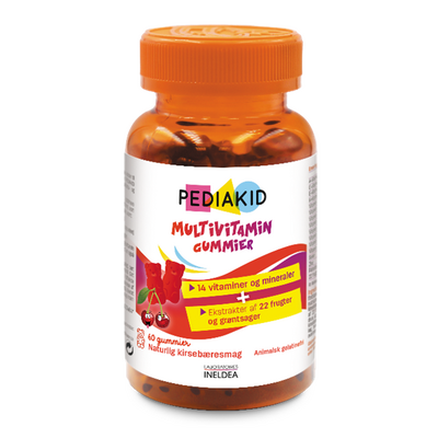 Er det vigtigt for dig at dit barn får vitaminer nok? Så er Pediakid Multivitamin Gummies lige noget for jer! Kosttilskuddet er lavet med 14 forskellige nødvendige vitaminer og mineraler. Vitamingummies indeholder derudover et ekstrakt fra 22 frugter og grøntsager, som bidrager til indtagelse af de mikronæringsstoffer, der er vigtige for børn. Kosttilskud fra Pediakid er designet specielt til børn, da vingummierne er udformet som små søde bamser - og er nemme for børn at tygge! De smager af dejlige kirsebær, som de fleste børn vil elske. Ineldea Laboratories' ønsker at skabe produkter, der giver børn næringsstoffer og aktive ingredienser af højeste kvalitet. Produktserien Pediakid er bestseller og nr. 1 i Frankrig, for producenter der udbyder vitaminer til børn.