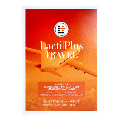 LactiPlus Travel er mælkesyrebakterier, der er perfekte at have med på farten i rejsetasken. LactiPlus Travel aktiveres først ved kropstemperatur og kan derfor opbevares uden for et køleskab, så de er nemme at have med på ferie. Produktet er tilsat den probiotiske gær Saccharomyces boulardii.