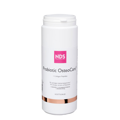 NDS Probiotic Osteocare er et kosttilskud fyldt med mælkesyrebakterier. Produktet i pulverform indeholder 10 udvalgte tarmbakteriestammer, som bidrager til en afbalanceret tarmflora. Derudover indeholder kosttilskuddet mineraler og gavnlige kollagenpeptider, som bidrager til huden og dens spændstighed. Med alderen falder kollagenproduktionen, og det kan derfor være en fordel at supplere med ekstra kollagenpeptider for at bidrage til hudens genoprettelse.