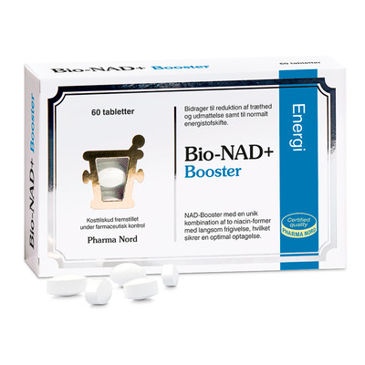 Bio-NAD+ Booster er et kosttilskud, der indeholder en unik kombination af to niacin-former (nikotinamid og nikotinsyre), der hjælper med at øge NAD+ niveauet i blodet. NAD er et stof, der findes i alle kroppens levende celler og indgår i deres energiomdannelse. Med alderen reduceres kroppens naturlige NAD-produktion, men niacin (i form af nikotinamid og nikotinsyre) booster NAD+, der omdannes til NADH i kroppen.