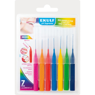 Ekulf pH Supreme Mixed-pakken er ideel til dig, som måske er i tvivl om, hvilken størrelse mellemrumsbørste, der passer til dig og dine tænder. Den indeholder 7 stk. mellemrumsbørste i forskellige størrelser, så du nemt kan prøve dig frem. De cylinderformede børster sikrer renseeffekt af højeste kvalitet, mens det fleksible hoved lader dig nå selv svært tilgængelige områder i munden.