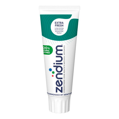 Zendium Extra Fresh tandpasta er særlig udviklet til at give frisk ånde. Tandpastaen har en stærk smag af mint, der sammen med Zendiums unikke enzym protein sammensætning er med til at neutralisere bakterier, som giver dårlig ånde. Zendium Extra Fresh indeholder fluorid (0,15% F-), der sammen med enzymer, colostrum og xylitol giver ekstra beskyttelse mod cariesangreb.